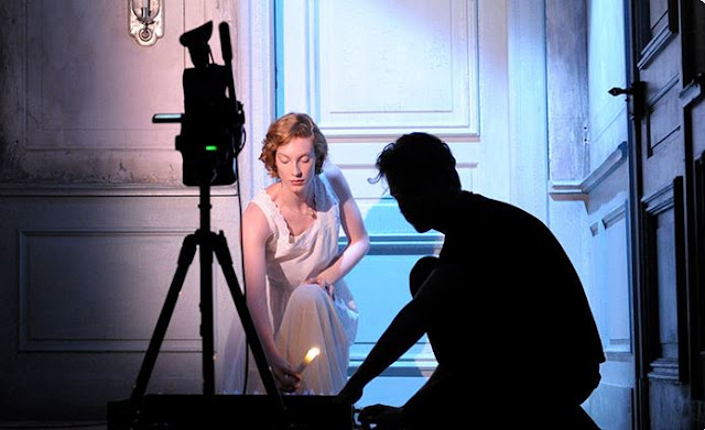Fraulein Julie is possible one of the most beautiful films I have ever seen; if it can be catalogued as such. Filmed on the stage and projected on the screen, this adaptation of the classic can be considered theatre, film or both. The preciseness and artistry required to recreate the atmosphere of the house, the correct lighting states and to be able to film it live, with no cuts, but flawlessly and smoothly is incredible. The intimacy and closeness of the shots brought us into the world of Kristin, blatantly ignored in the original version of the play. We see her through different eyes this time, as a strong, devoted woman, in love with Jean but with dreams and aspirations of her own. The ultra-naturalistic film setting capturess every action and turns it into an almost -religious rite: unbuttoning a shirt, a shaving knife smoothing the skin, pressing flowers into a bible... And this sense of extreme intimacy couldn't be achieved without the achingly precise sounds, all produced live on stage using all kinds of objects. The cello placed on stage also creates a strikingly beautiful image.